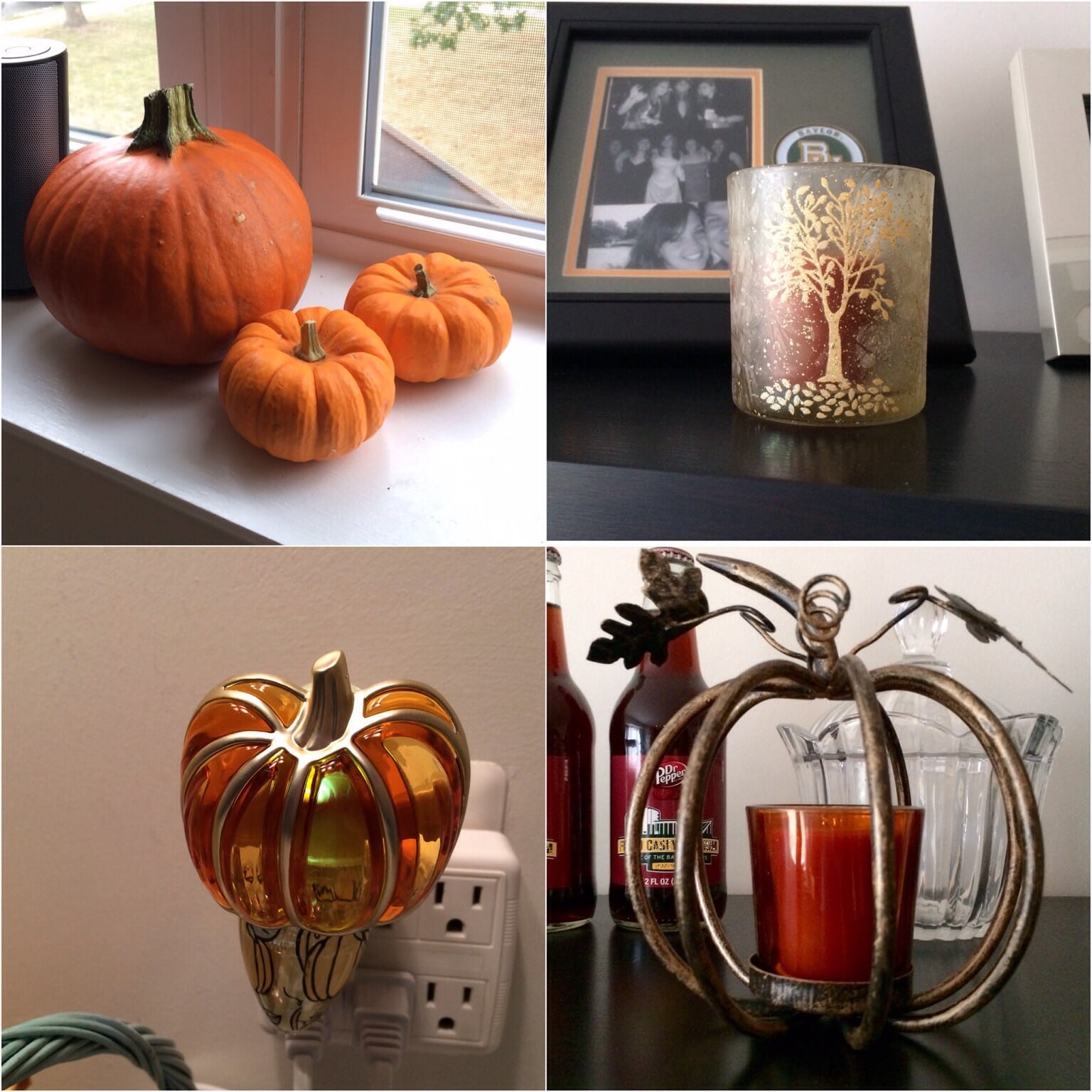 Like many other people around this time of year, I have a thing for pumpkins. Pumpkin decorations around my apartment make me very happy! Top Left: My real pumpkins on the window sill. Top Right: Tree candle holder from Pier 1. Bottom Left: Pumpkin Bath & Body Work fragrance plug. Bottom Right: Another Pier 1 goody – a pumpkin-shaped candle holder.