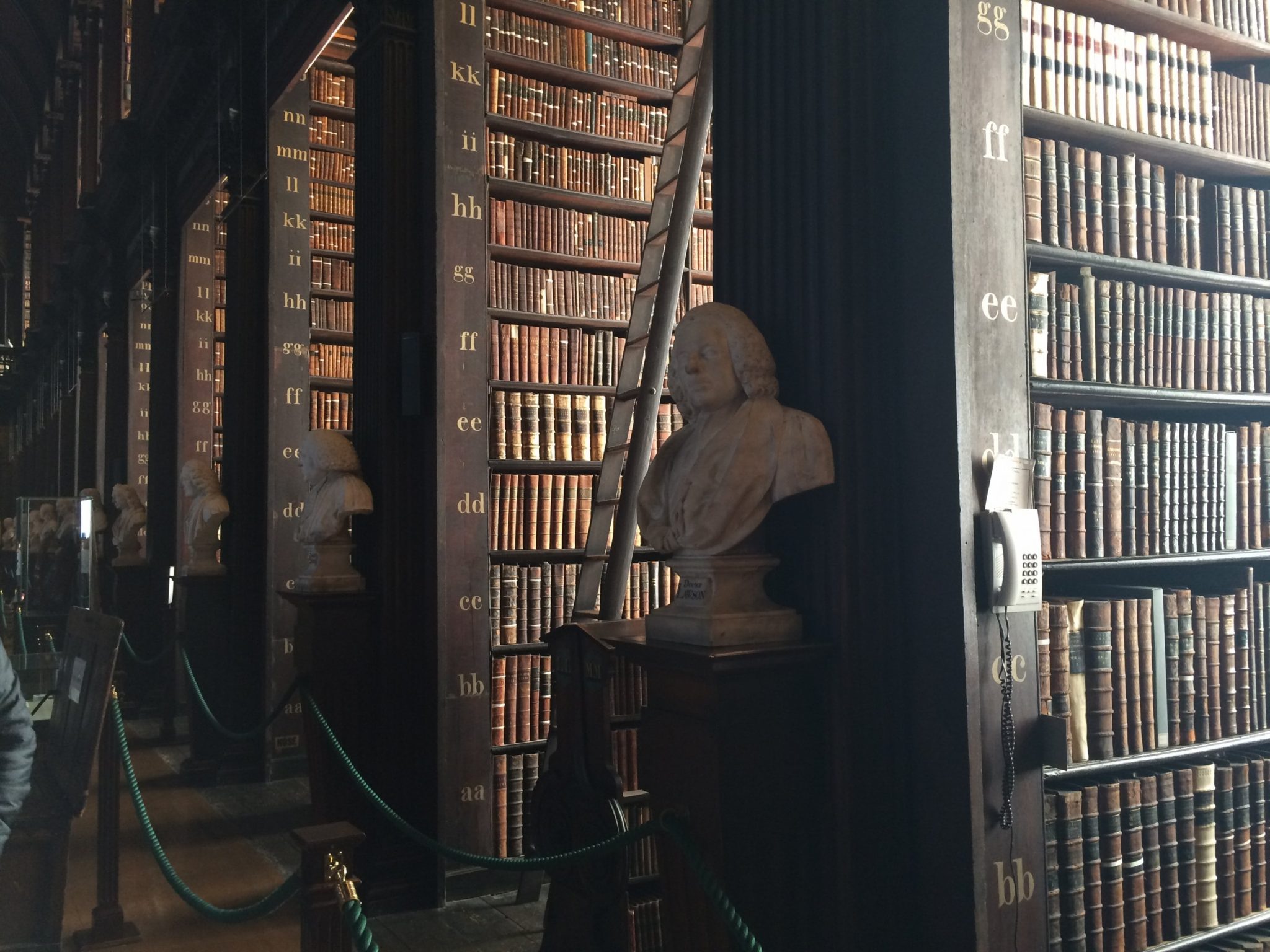 One ticket gives you admission into both the Book of Kells exhibit and the Trinity College Library. No pictures are allowed inside of the Book of Kells exhibit, but (thank goodness!) pictures are allowed in the library. The Book of Kells is a Gospel manuscript written in Latin in gorgeous calligraphy. There are stunning illustrations on nearly every page. The manuscript is believed to have been written around the year 800 AD in an Irish monastery. I’ve never seen a more beautiful book! Before entering the room to view the book, you walk through a room full of information on the Book of Kells and other important monastic writings.