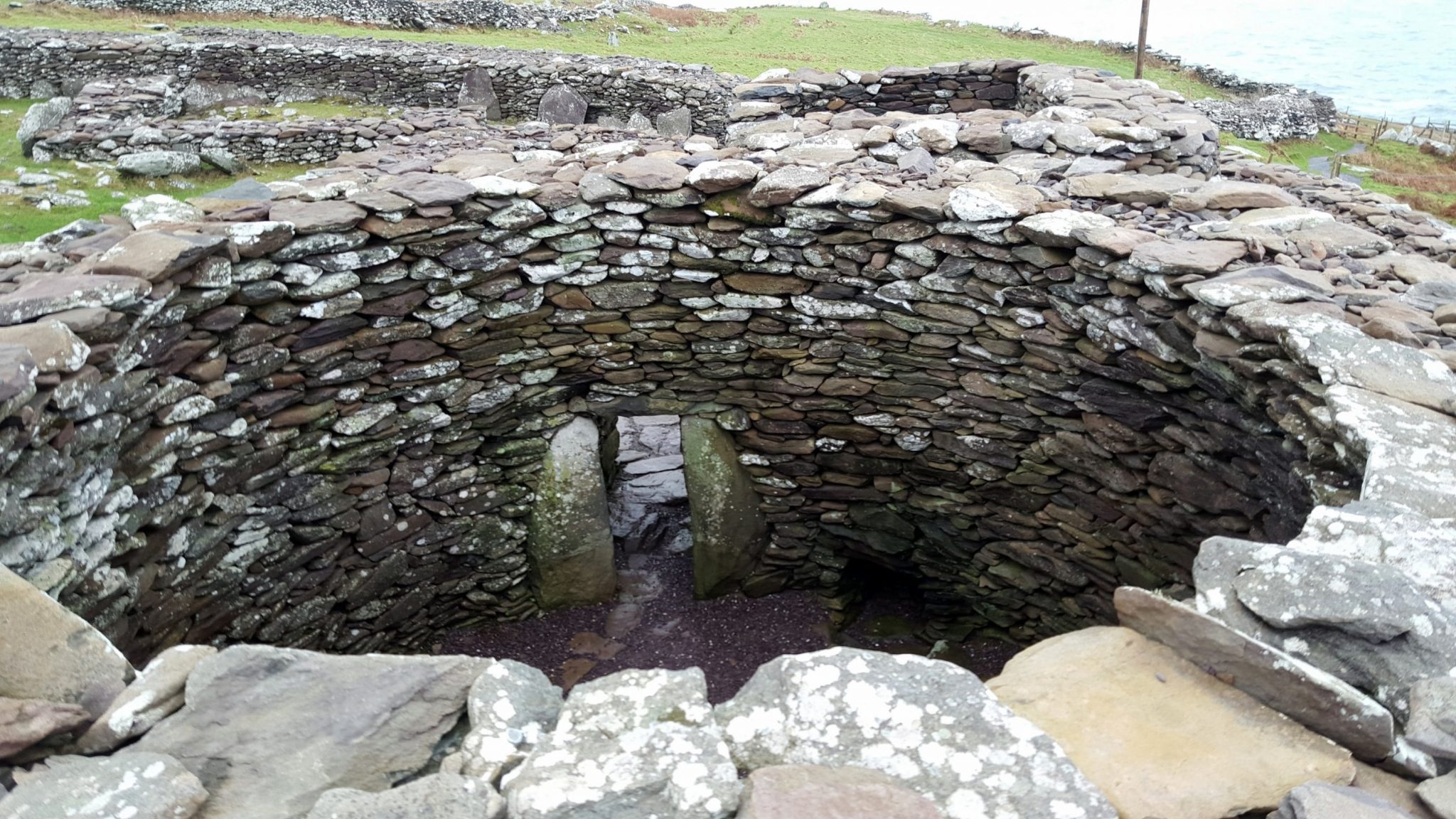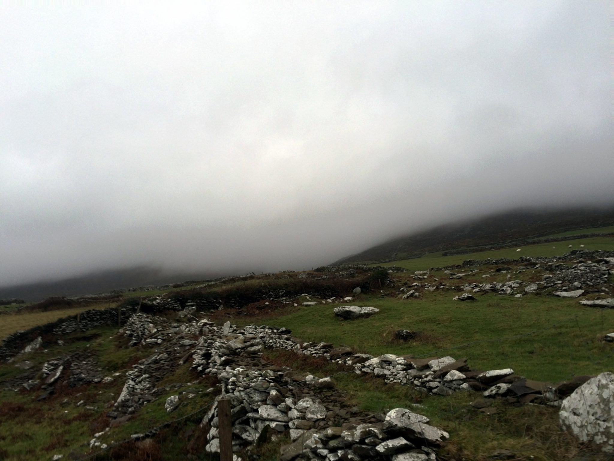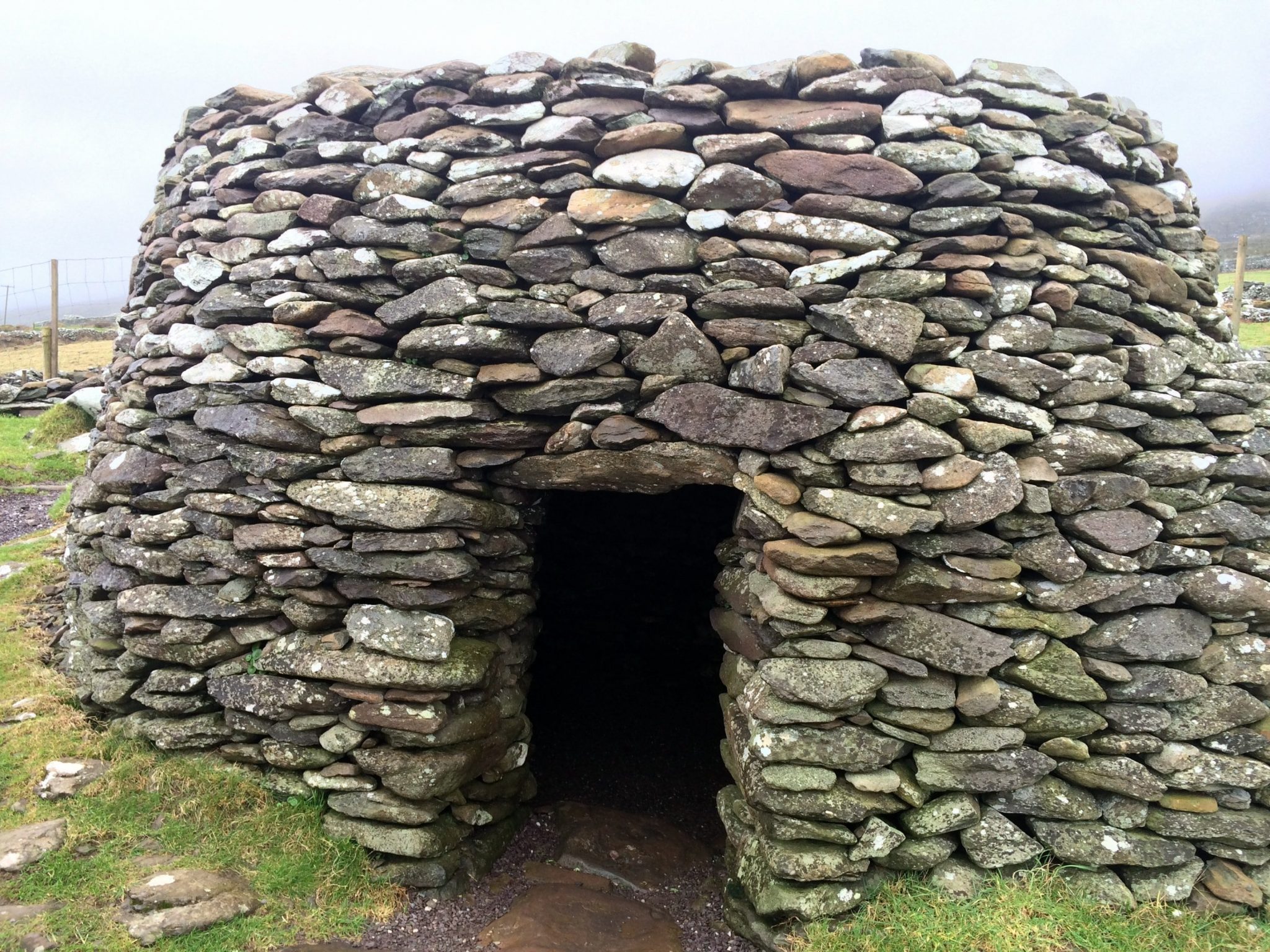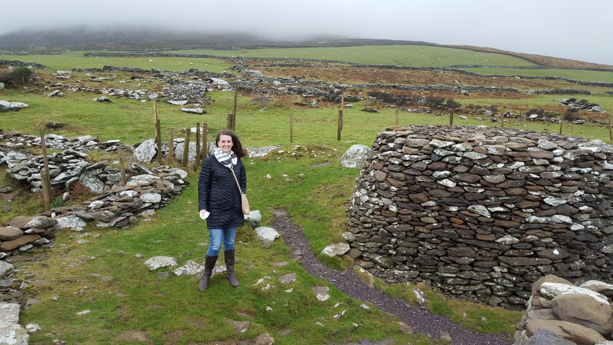 A collection of ancient homes called the Fahan Beehive Huts sit just west of the town of Dingle. Their year of origin is not officially known, but some historians think they date back to the 12th century when Norman invaders forced farmers out from more prosperous areas of Ireland. This is an easy stop off of Slea Head Drive – just park your car on the side of the road, pay a person inside of a little hut a small admission fee (cash only), and walk up the hill to the ancient homes. Once again, we were the only ones there, so being alone along with the crazy wind and fog added to the mystery of the ruins.