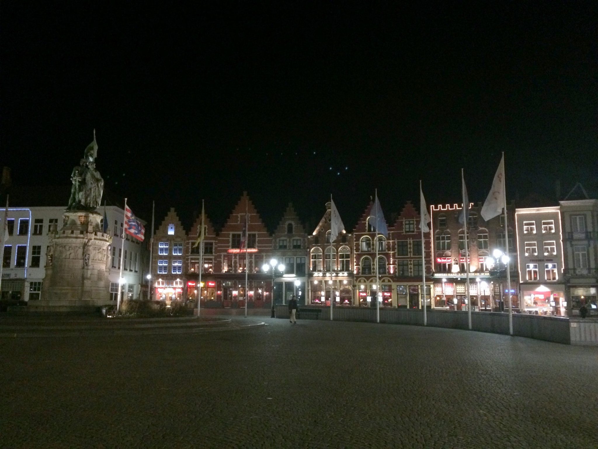 We arrived in Bruges late at night after a nearly three hour drive from Galway to Dublin, a flight from Dublin to Brussels, and an hour train ride from Brussels to Bruges. When we arrived, we found out that the buses had stopped running, so we took a long walk form the train station to our Airbnb. We got some help with our route from a few locals, jumping right into our first non-English speaking country experience of this trip. At first we were hesitant to walk this far with our backpacks, but I’m so glad we did! We were introduced to this magical city during its quietest hours, all lit up at night.