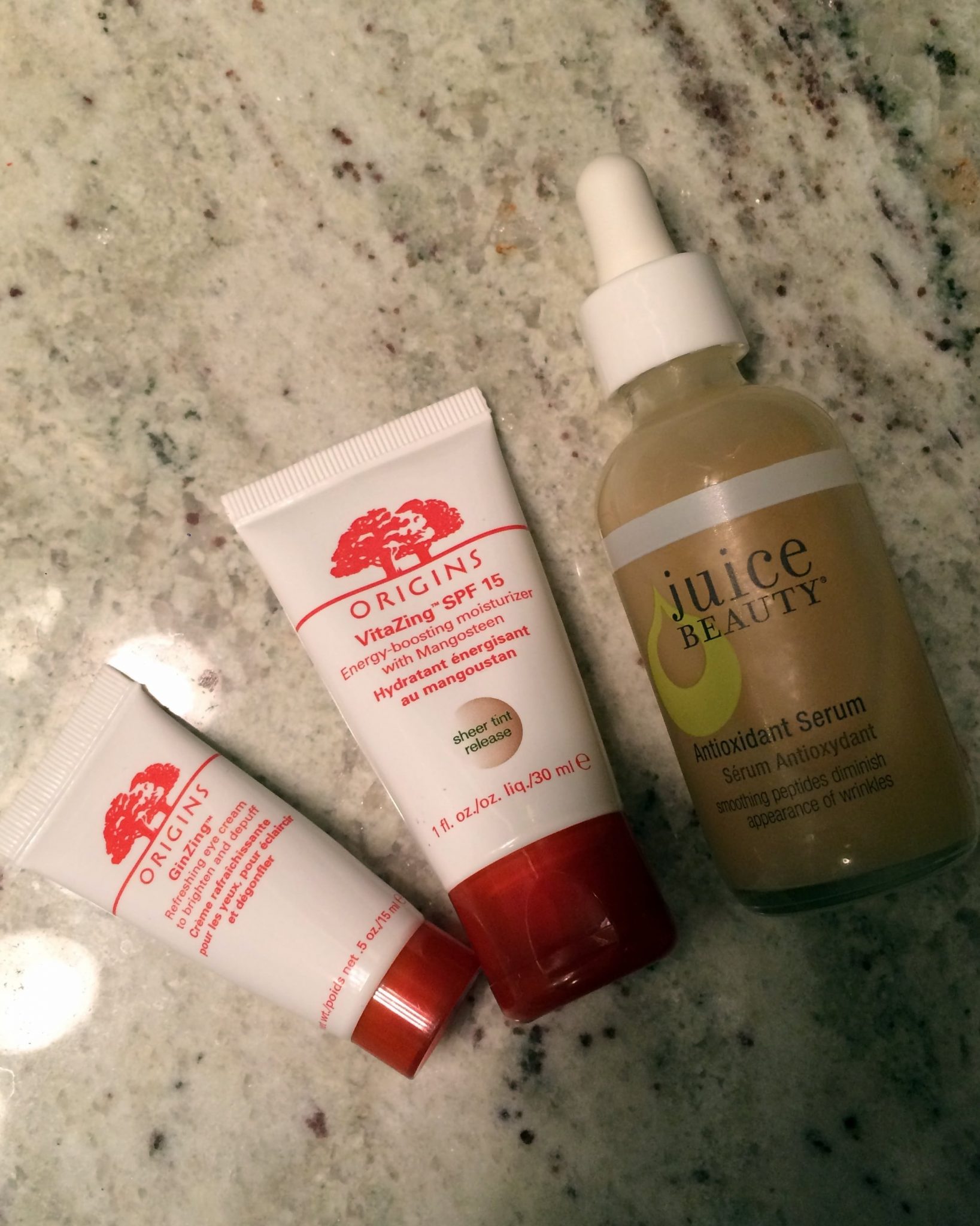 After the shower, I actually get back in to comfortable clothes and do my morning skin care. I’m currently using the products pictured below in the mornings.