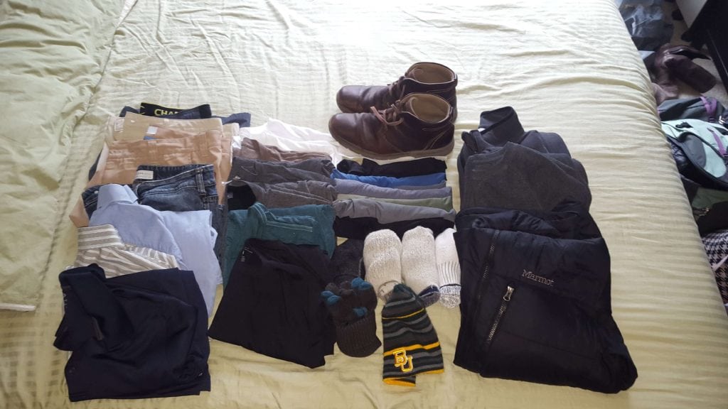 - I tried to find clothing that would take as little room as possible. This isn’t a huge deal for t-shirts and underwear, but for sweaters, jackets, and pants, it’s really important to consider the weight and size.