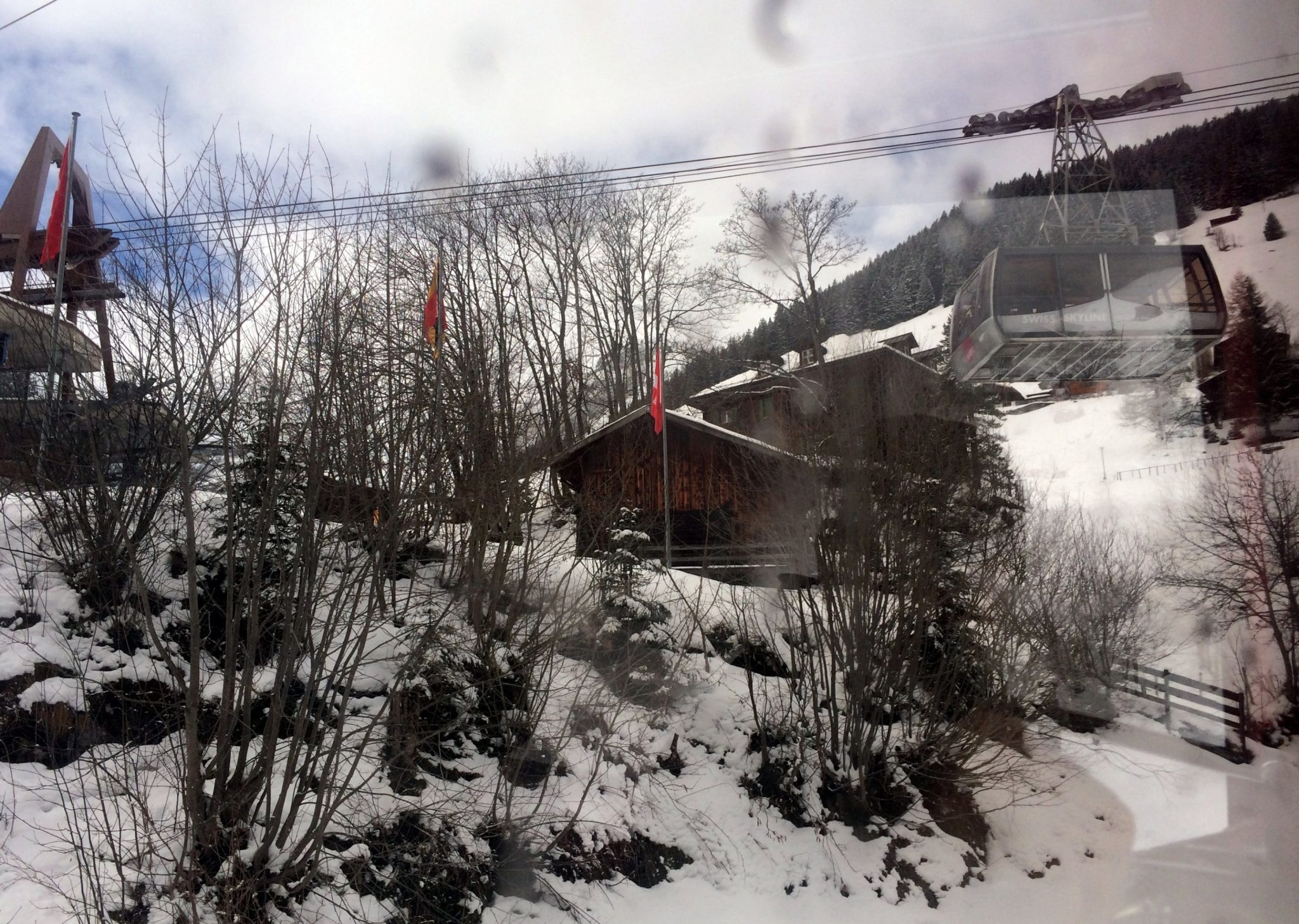 View out of our Swiss cable car to another Swiss cable car