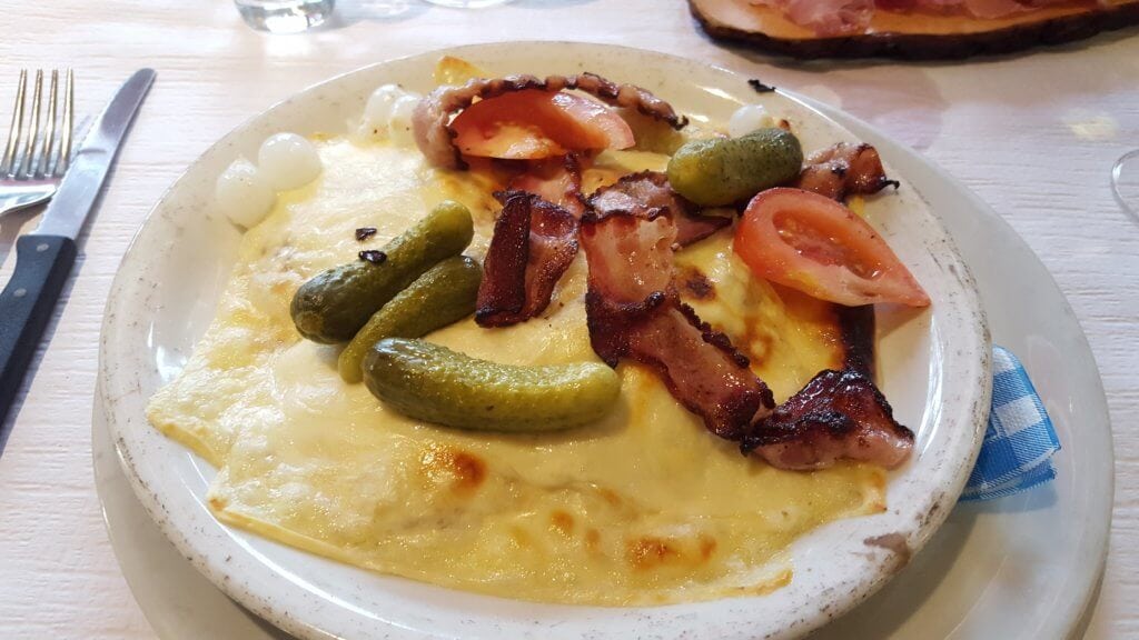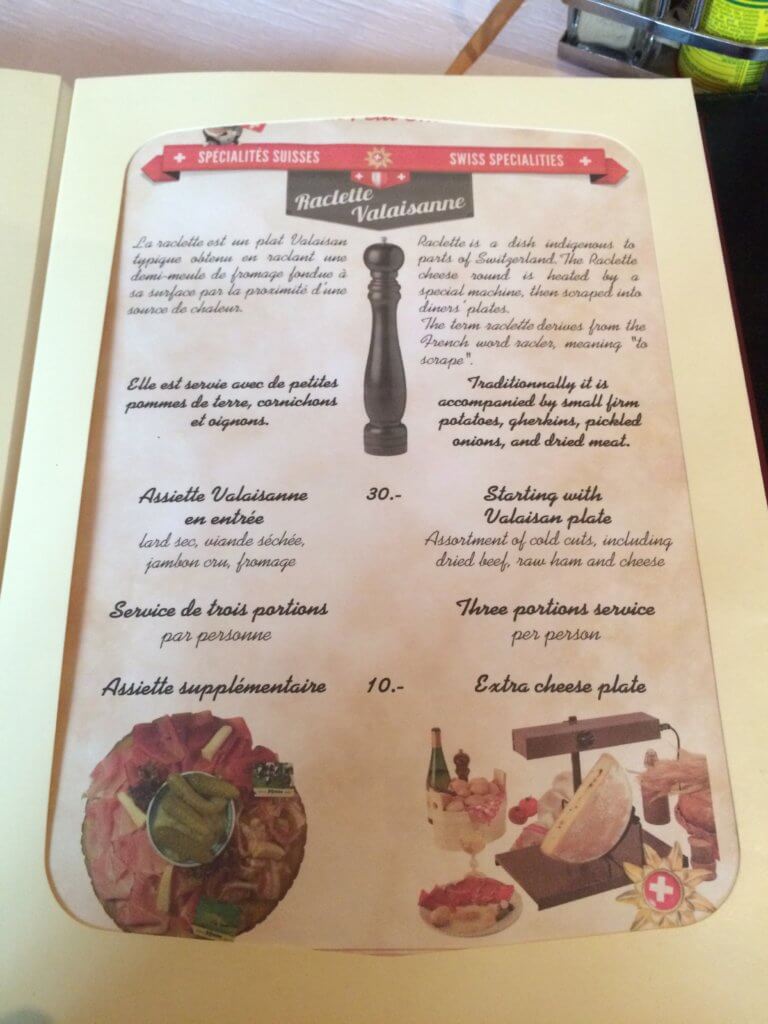The next day, we had our final lunch in Switzerland at a restaurant serving raclette, Swiss cheese that is melted on a pan and scraped off to eat with an assortment of food items – this place served it with bacon, pickles, and tomatoes. I wanted to make sure we had raclette before leaving Switzerland, so we stopped by a place near our hotel and the train station. It was definitely over-priced, but the food was delicious. The restaurant is decorated like a Swiss chalet which added to the fun!