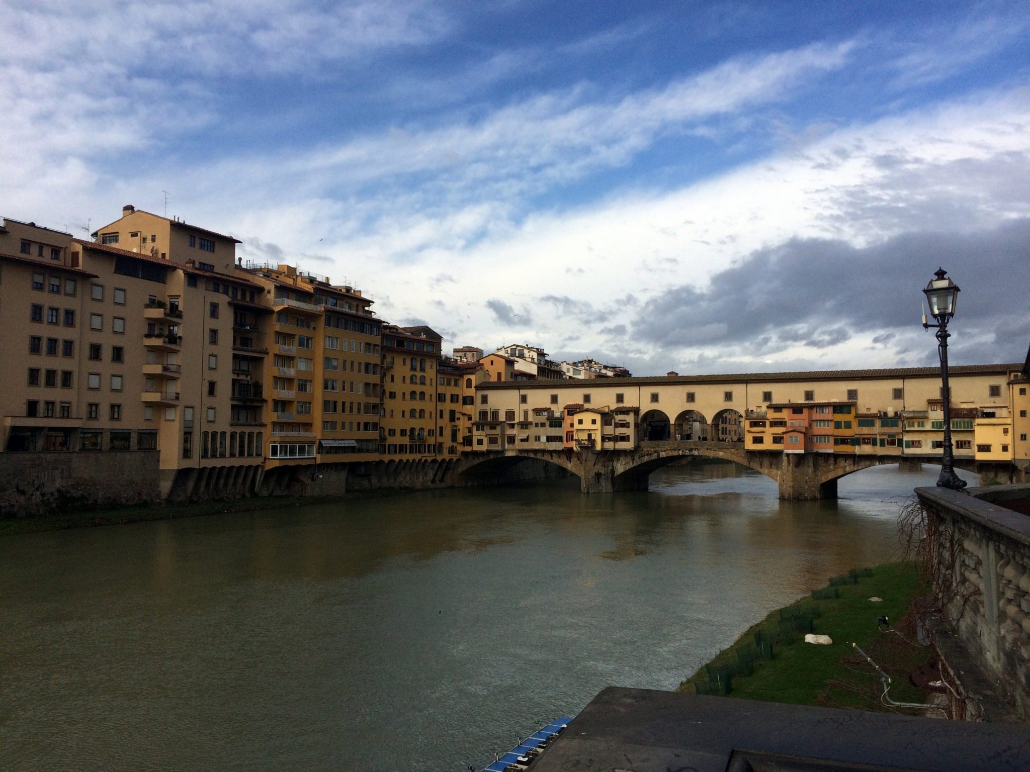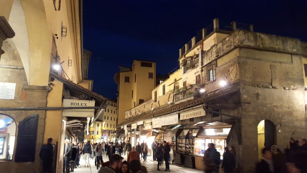 Once we dropped off our things, took photos of the apartment, and cleaned up, we headed out to see the city at night and find a bite to eat. The apartment was very close to the Ponte Vecchio, so we walked across the river on it. The bridge itself holds many jewelry shops – it was beautiful with the shops all lit up on the bridge at night!