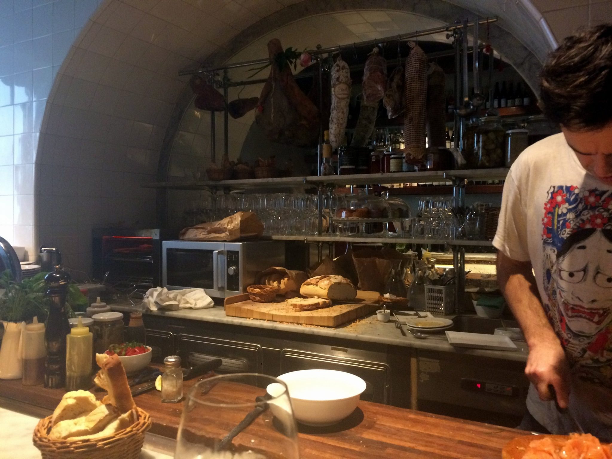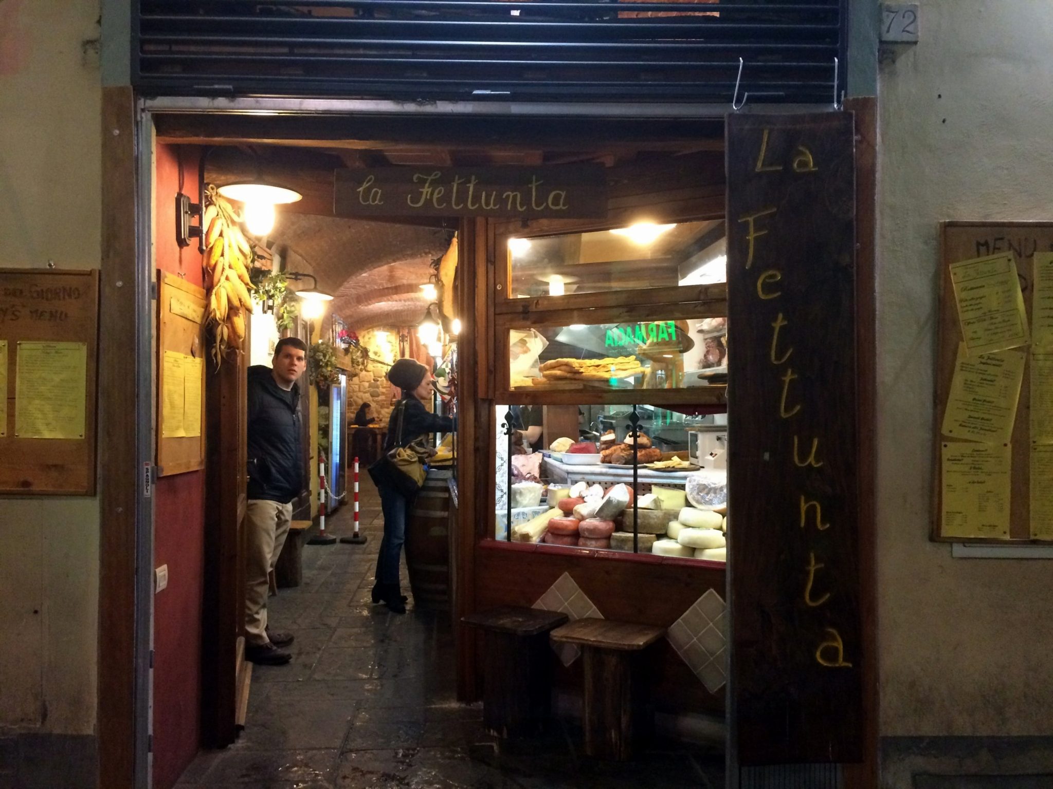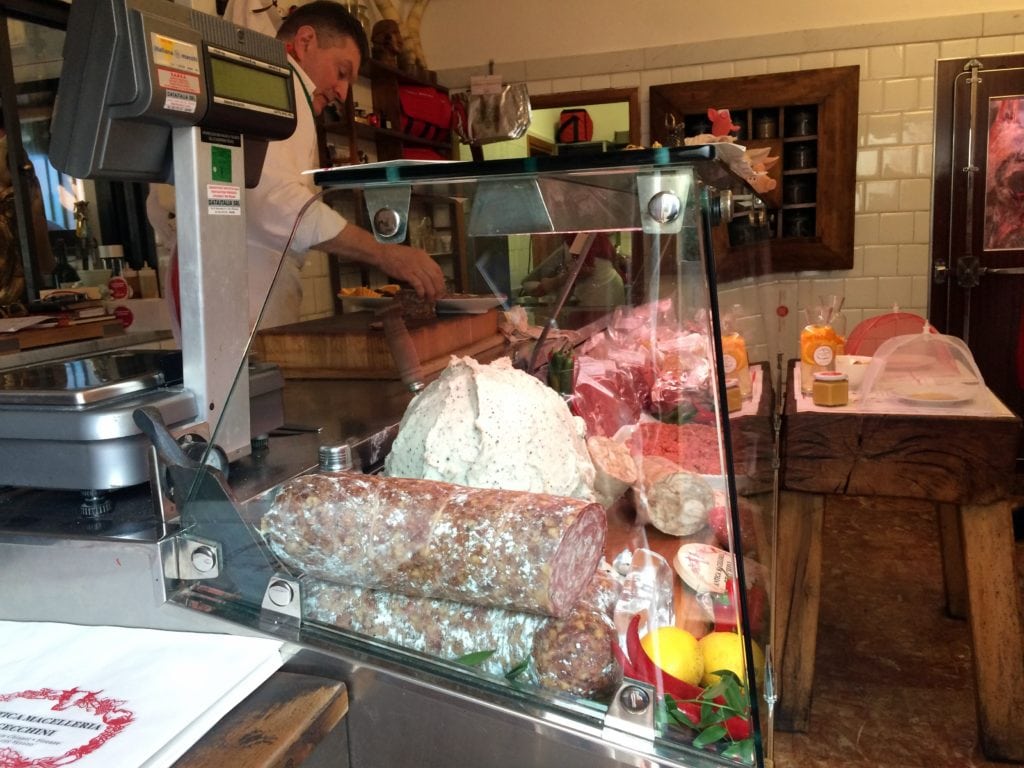 One of the best ways to try out as much food as you can in a short amount of time is to order a snack-sized portion at several different places, and that’s exactly what we were doing this day. Since the rain continued to come down, we decided to find another cozy restaurant and order a cheese plate (basically we are in love with dairy). We were lucky to be able to grab two spots at the bar in Il Santino Gastronomia, because this little eatery was packed! The bar seats gave us a view of all the food being prepped, and we were able to chat with servers as we ate. While the photo below isn’t the best quality, I wanted to share and point out the meats hanging in the back, the warm, ready-to-slice bread on the cutting board, and the fresh local herbs on the bottom left. ?