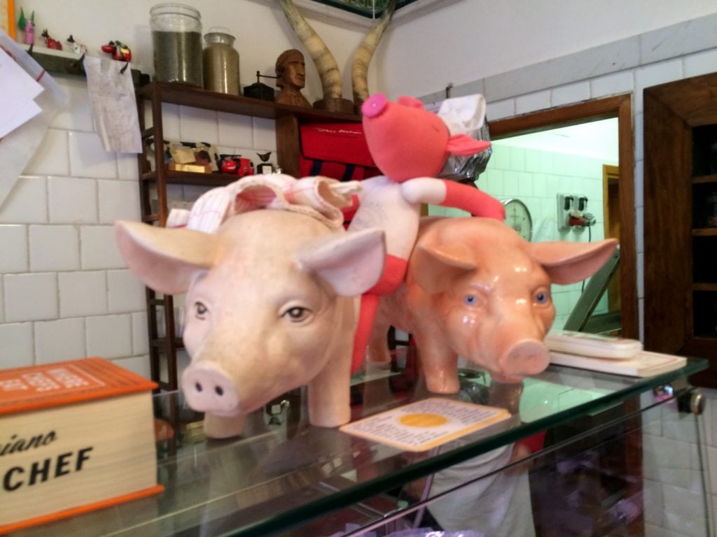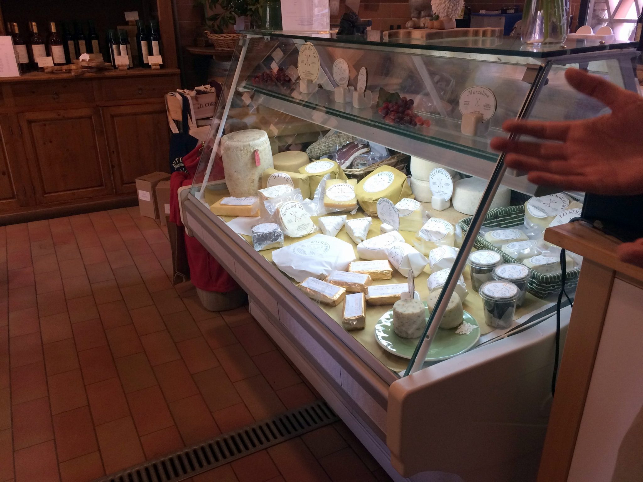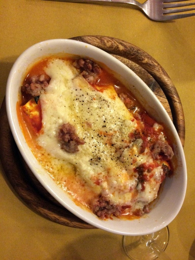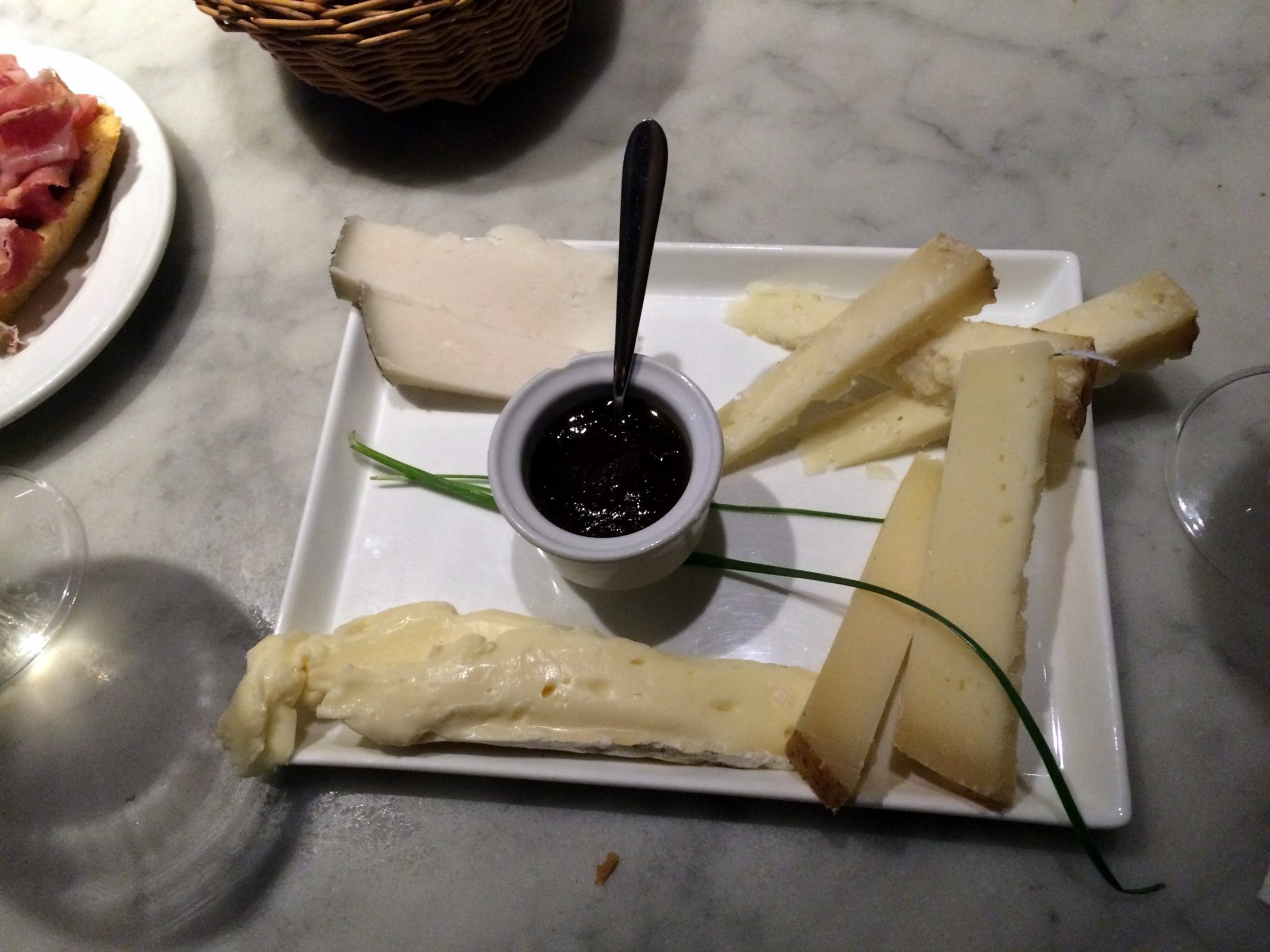 One of the best ways to try out as much food as you can in a short amount of time is to order a snack-sized portion at several different places, and that’s exactly what we were doing this day. Since the rain continued to come down, we decided to find another cozy restaurant and order a cheese plate (basically we are in love with dairy). We were lucky to be able to grab two spots at the bar in Il Santino Gastronomia, because this little eatery was packed! The bar seats gave us a view of all the food being prepped, and we were able to chat with servers as we ate. While the photo below isn’t the best quality, I wanted to share and point out the meats hanging in the back, the warm, ready-to-slice bread on the cutting board, and the fresh local herbs on the bottom left. ?
