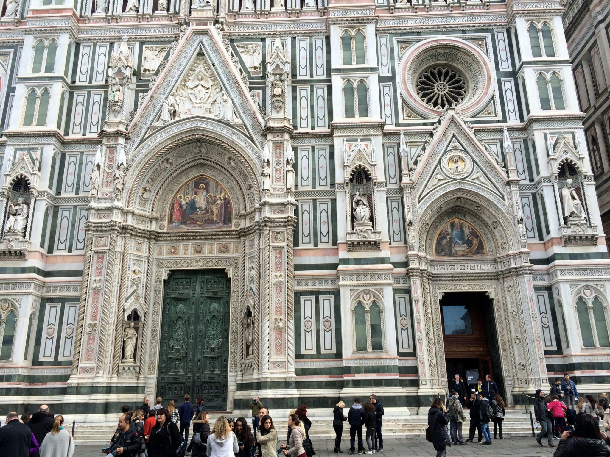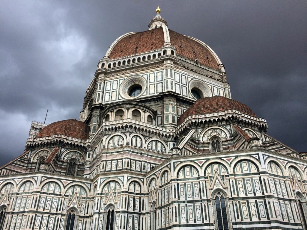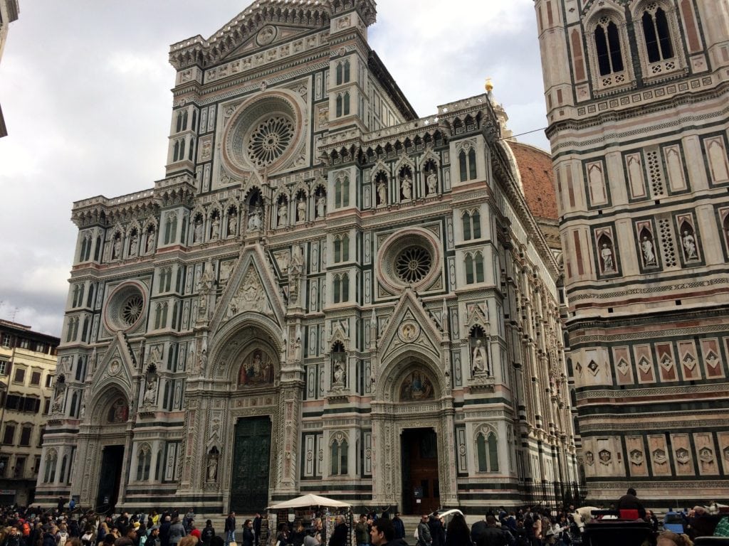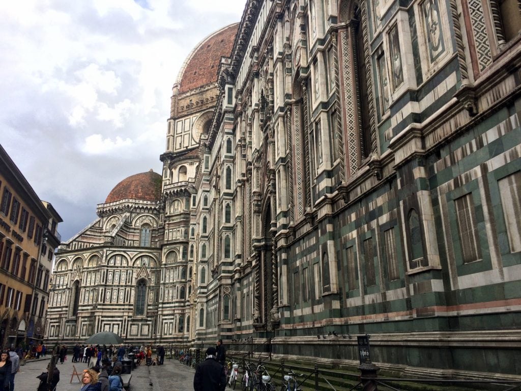 The Florence Cathedral (aka the Duomo) has one of the top three most beautiful building exteriors I have ever seen. It has an intricate marble facade with various shades of pink and green and showcases ornate sculptures representing historical figures and events. The entire exterior is a stunning, detailed work of art.