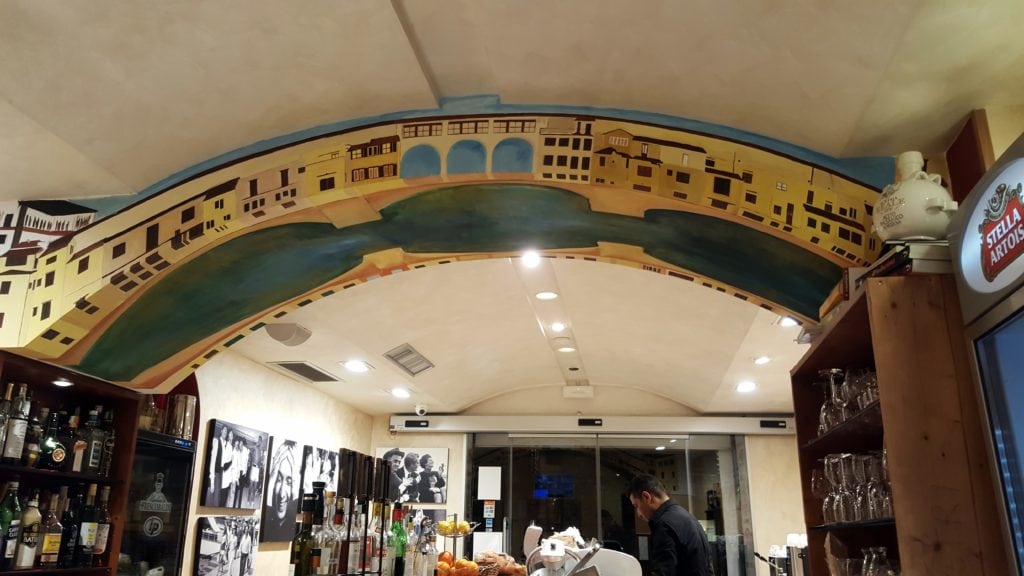 Across the bridge, we were happy to see streets full of amazing looking restaurant options filled with all kinds of people – locals and tourists alike. We were in the Oltrarno area of Florence, and everything seemed so full of life! We walked along the streets, taking in the sights and sounds, and came across an interesting looking Italian deli. We ordered a couple sandwiches for dinner. The deli had a cute painting of the Ponte Vecchio on the ceiling (see photo below).