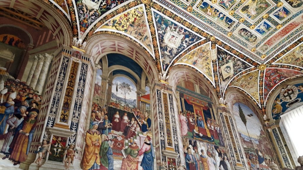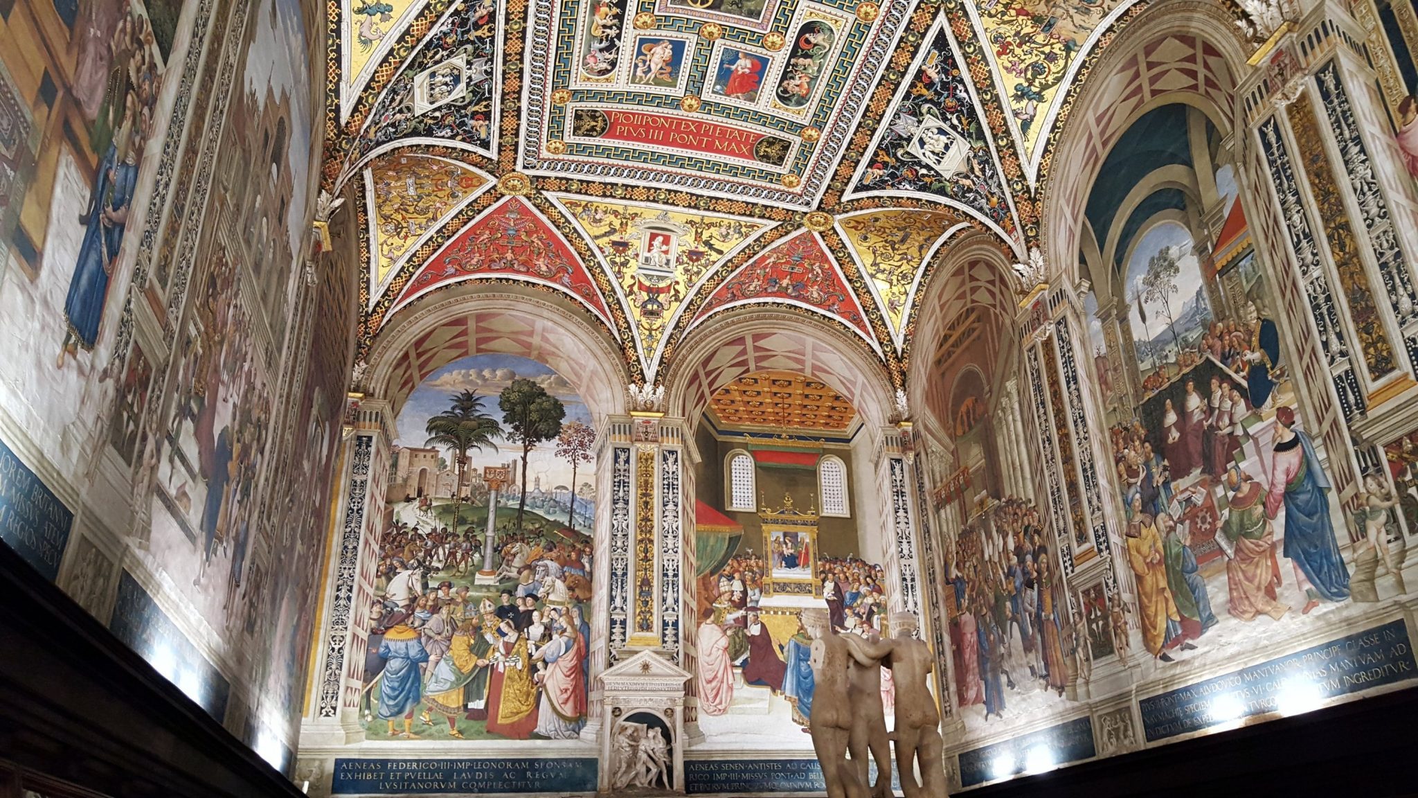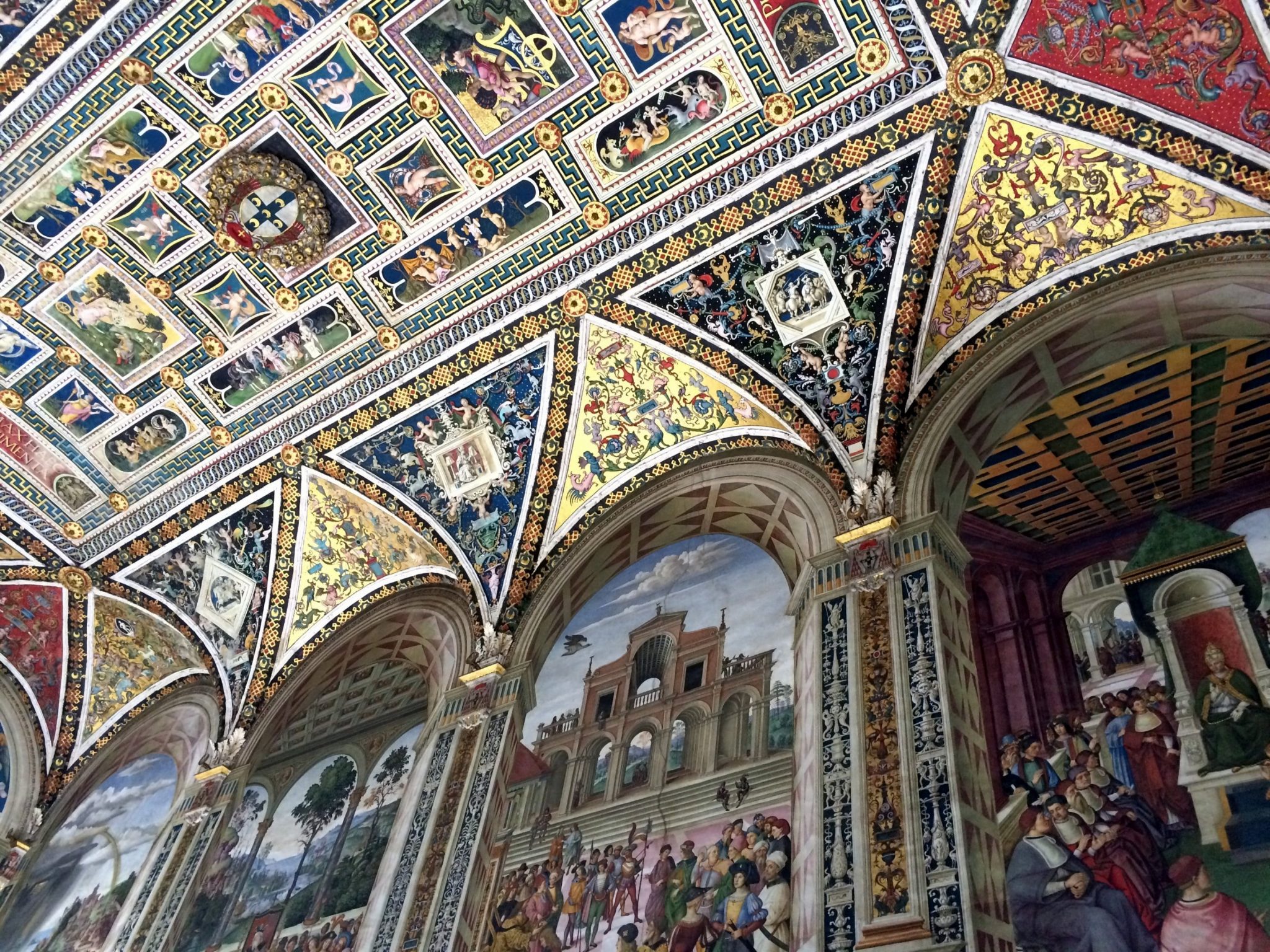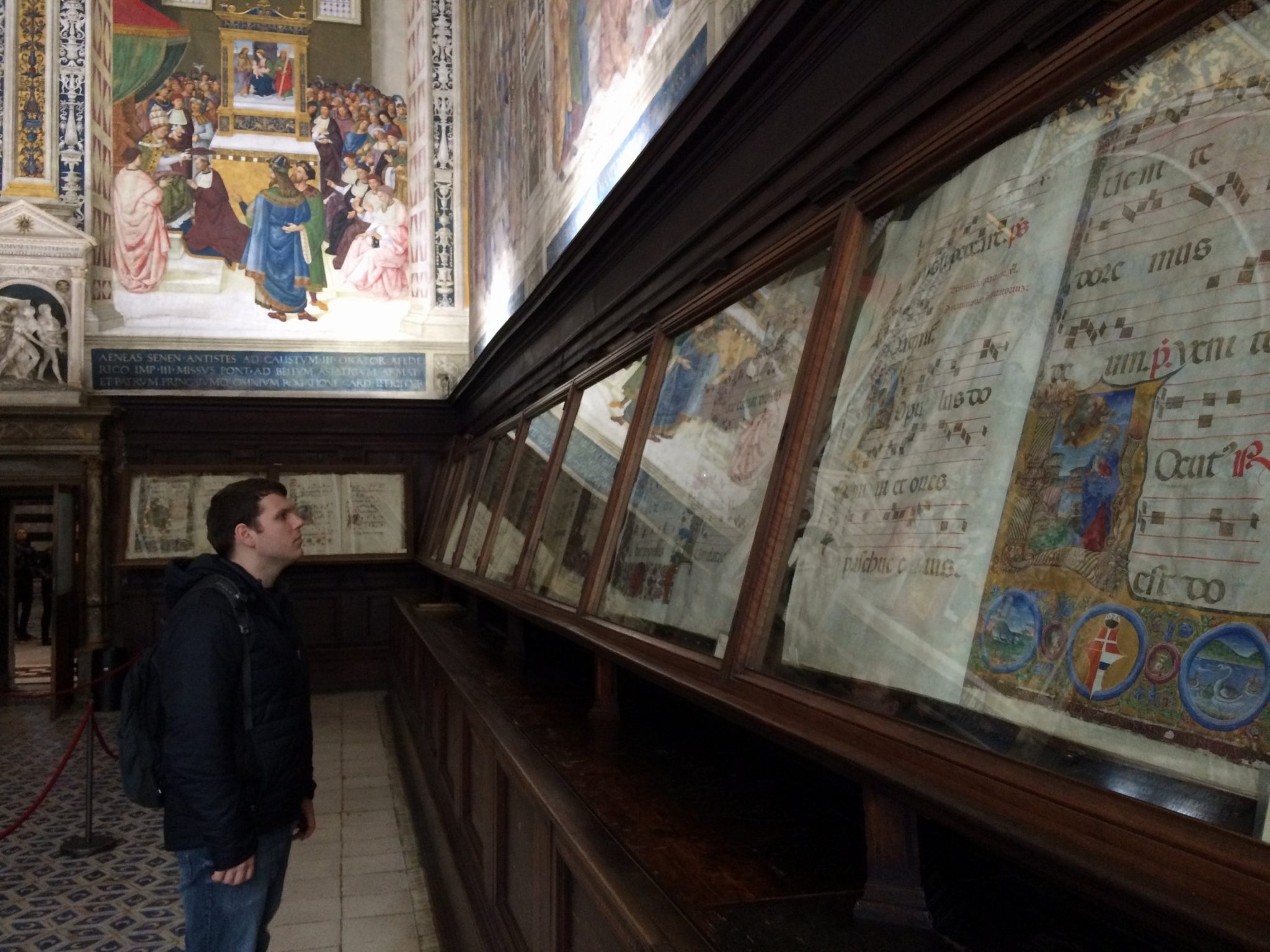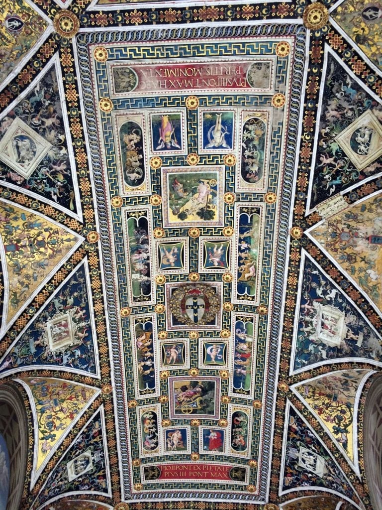 Before leaving the Cathedral interior to explore the other parts of the Cathedral complex, we stopped in the Piccolomini Library off the side of the main area. Following the frescoes from right to left, they tell the story of Pope Pius II, and his book collection is displayed under the paintings along the wall of the library. And, as expected after seeing the rest of the Cathedral, this space was truly stunning!