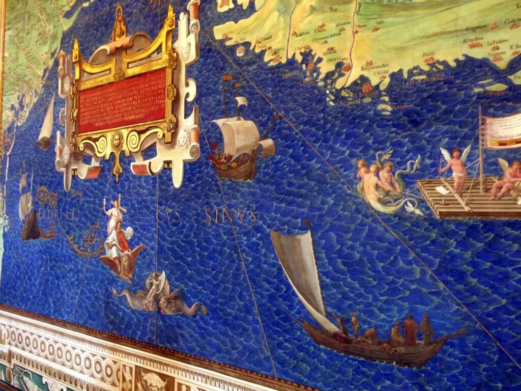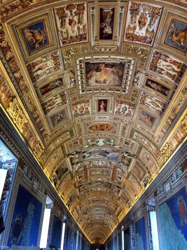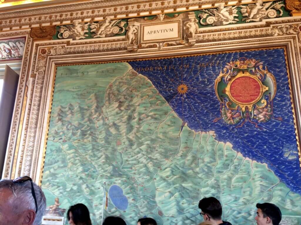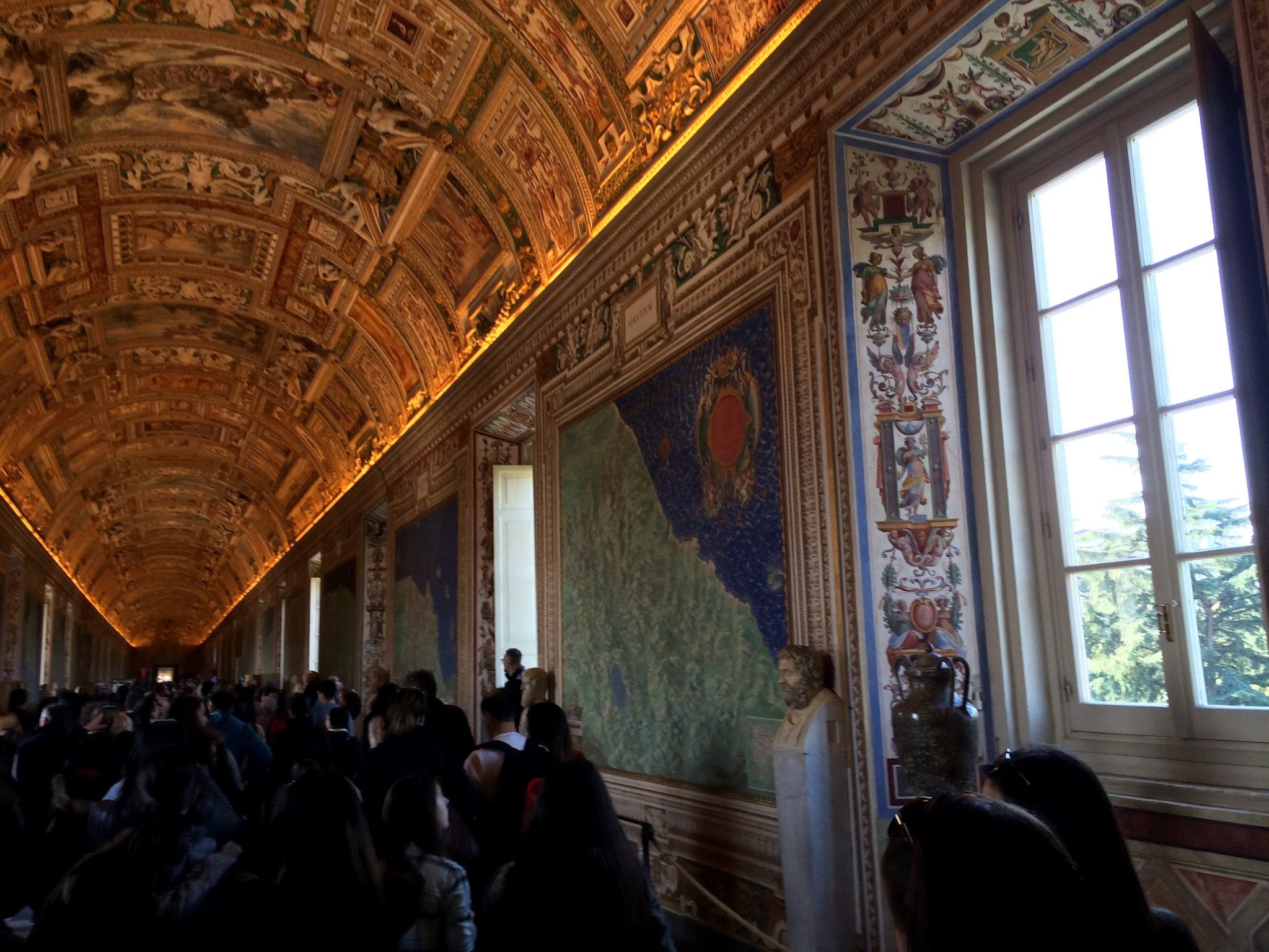 But, boy oh boy, was it crowded. I cannot speak for the rest of the year, but I encourage you to prepare for insane crowds and slow walking if you are visiting the Museums during March. Just look at the hallway in the photo above! Thankfully, we had radios to listen to our guide speak while we walked, but we were in a bit of shock with the crowd. My favorite room was the one pictured above and below: the Gallery of Maps. This room showcases gorgeous map frescoes of Italy and other properties of Pope Gregory (1572-1585). Despite the crowds, I tried to get a few somewhat decent shots of some of the paintings.