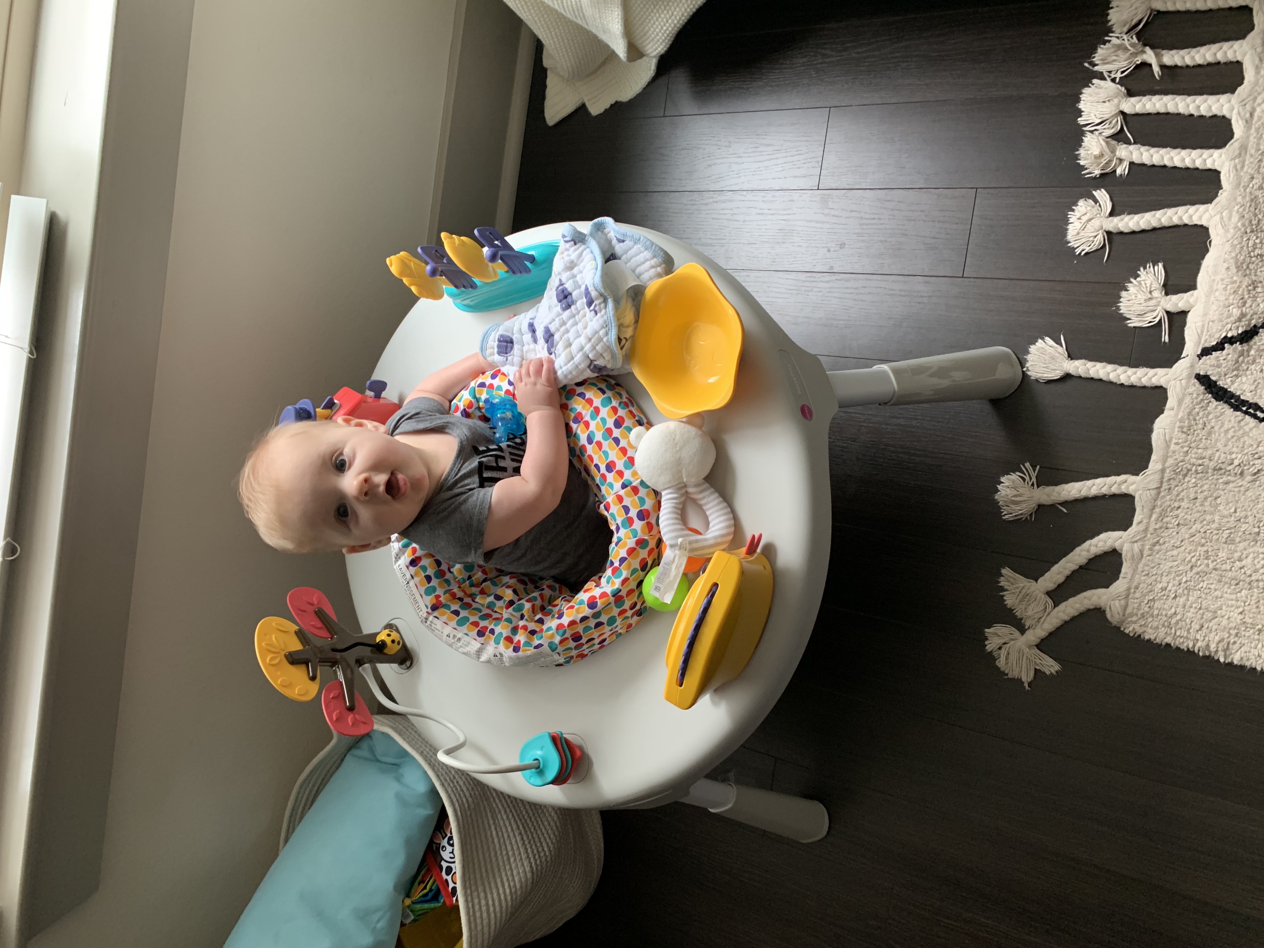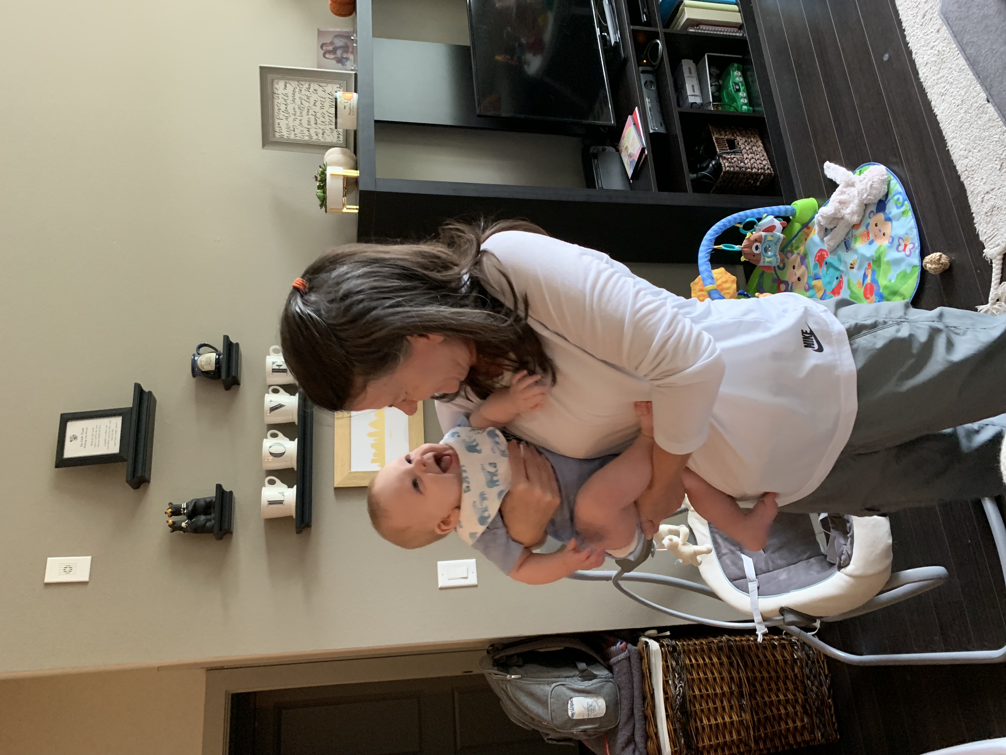 During our outings, we take a trail walk, go to the grocery store, walk to a coffee shop, meet a friend for a playdate, etc. After that, Carson is more than ready for some fruit for lunch and nap number two. The second nap is usually the longest nap of the day, so I try to do some more cleaning during this time or do something fun like work on his baby book, read a book, or watch a TV show. When Carson wakes up, he has his third bottle of the day, and we play some more and maybe walk down the hall to check the mail and wave to the people at the front desk. Depending on the timing of his second nap, he may need another nap before being up for the evening around 5:45.