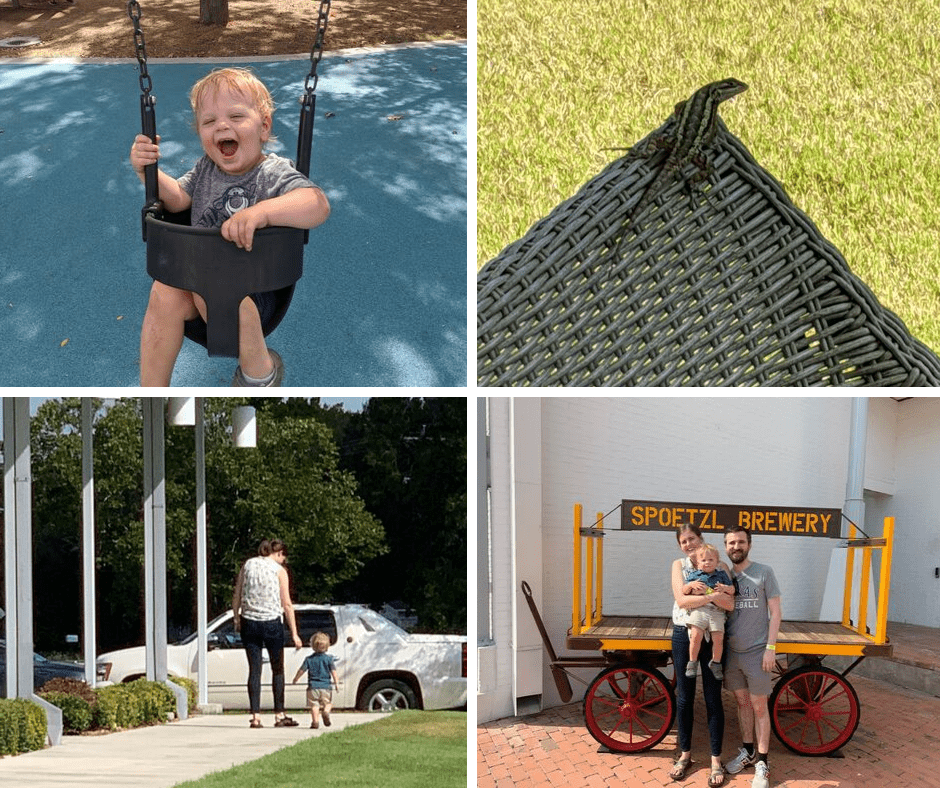 (1) Carson didn’t know how to feel about swings for a while, but now I think we’ve finally convinced him they are fun!