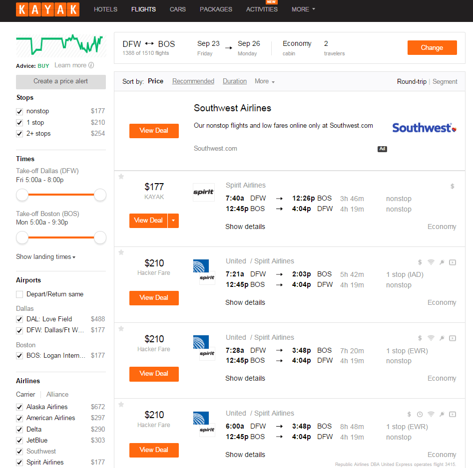 - Look up one-way flights using the flight search tool. You can often get the best deal by booking two one-way flights on different airlines. Kayak and other search tools will try to do this for you (see “hacker fare” options in screen shot above), but they don’t catch all of the deals. Once again, confirm those one-way flight prices directly on the airline’s website.