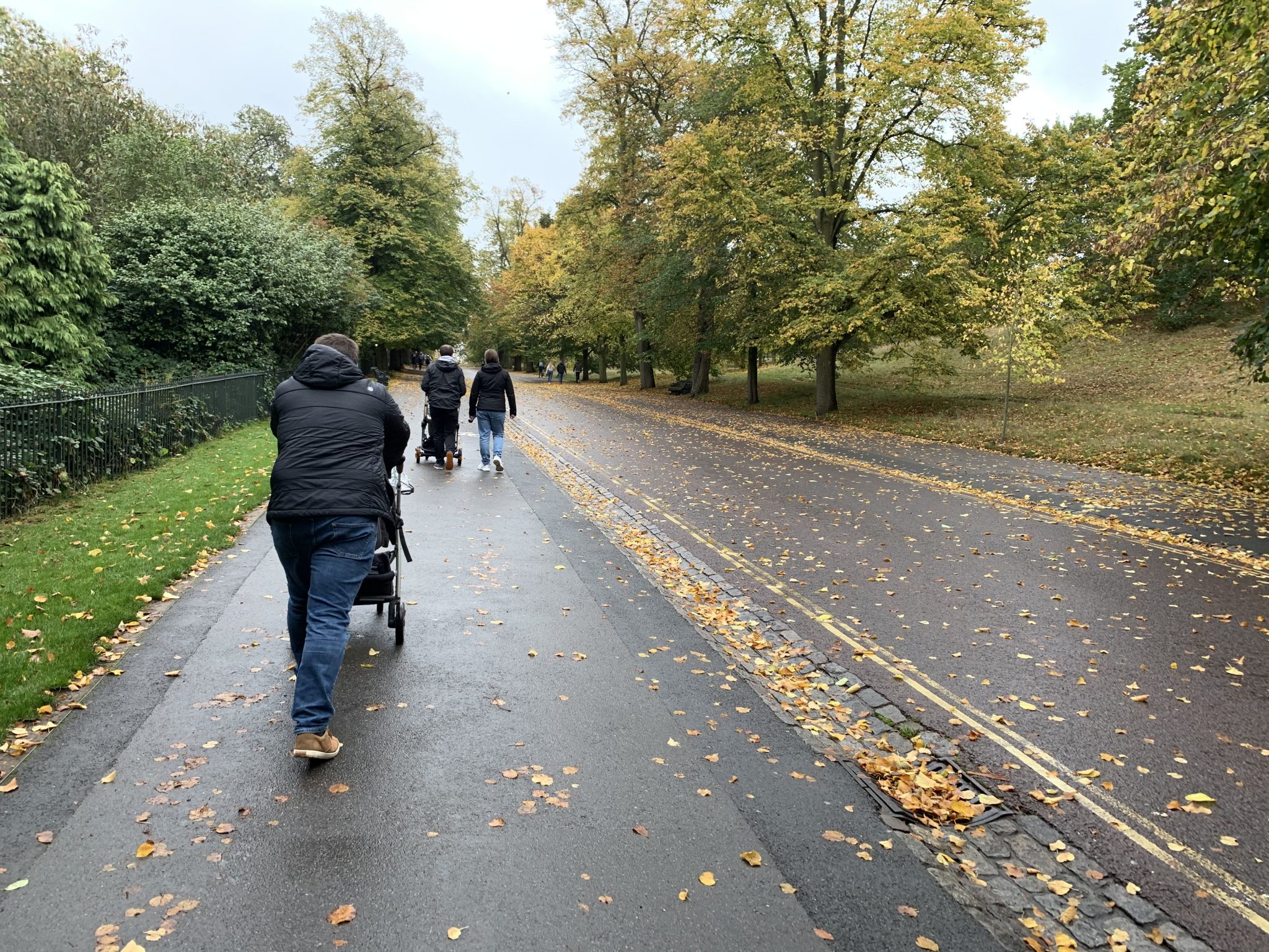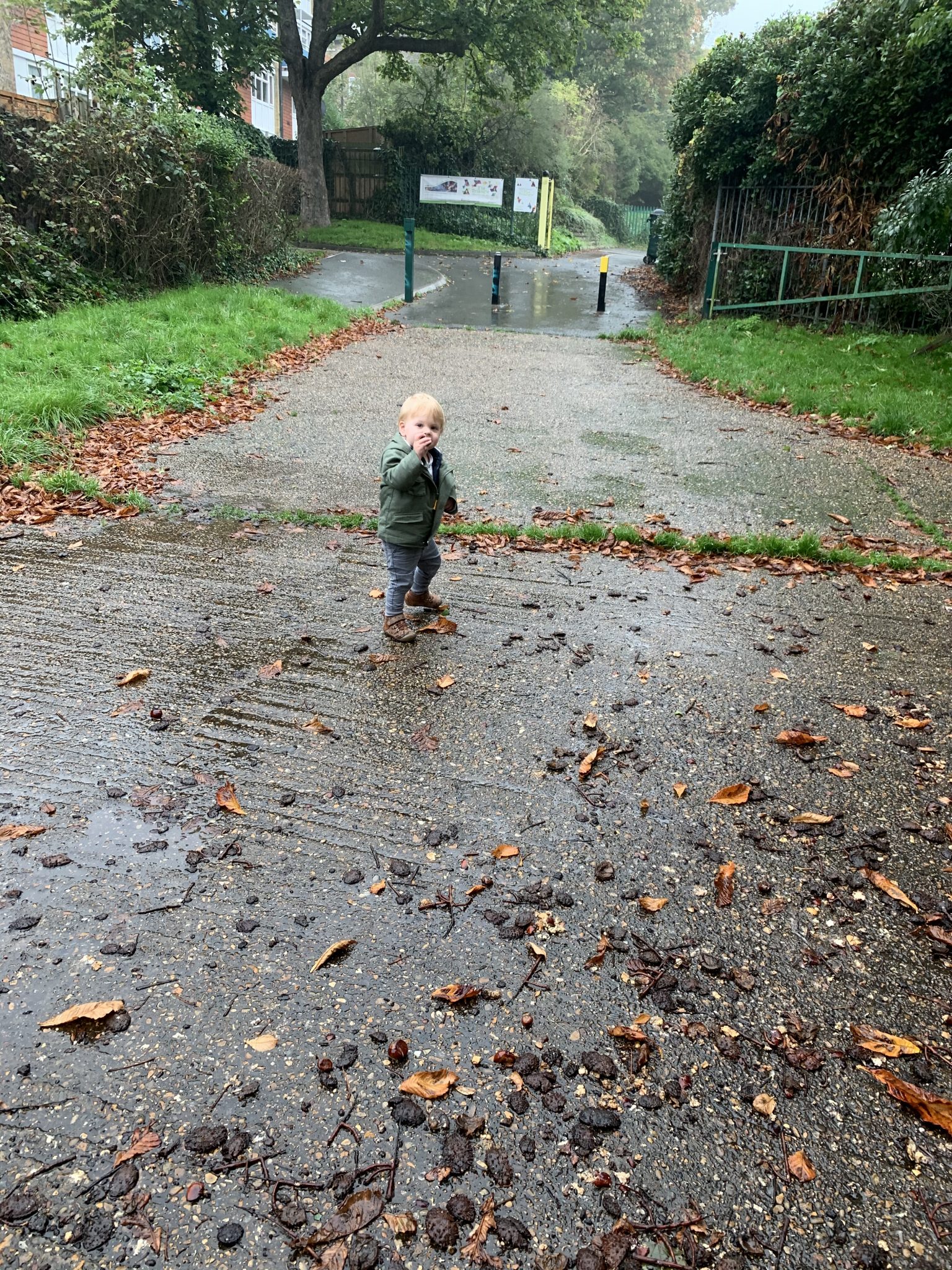 While Daniel tried to get a little more work done, Carson and I headed to an indoor soft play area for children. Unfortunately, the soft play place was just getting ready to close, so we couldn’t get in. We had walked about ten minutes in the rain to get there, and there wasn’t anywhere nearby for us to huddle in for shelter, so we decided to embrace the rain and run around a little park nearby.