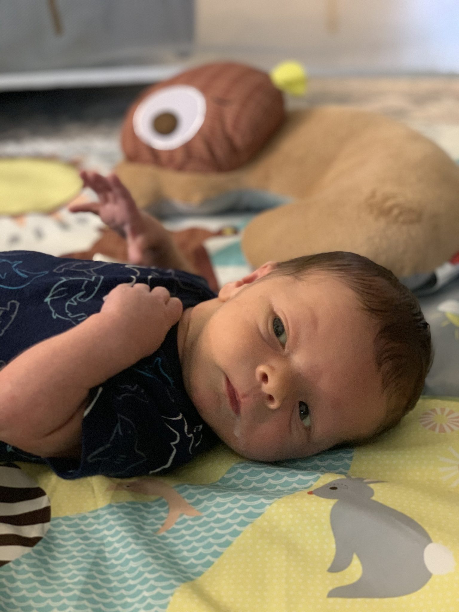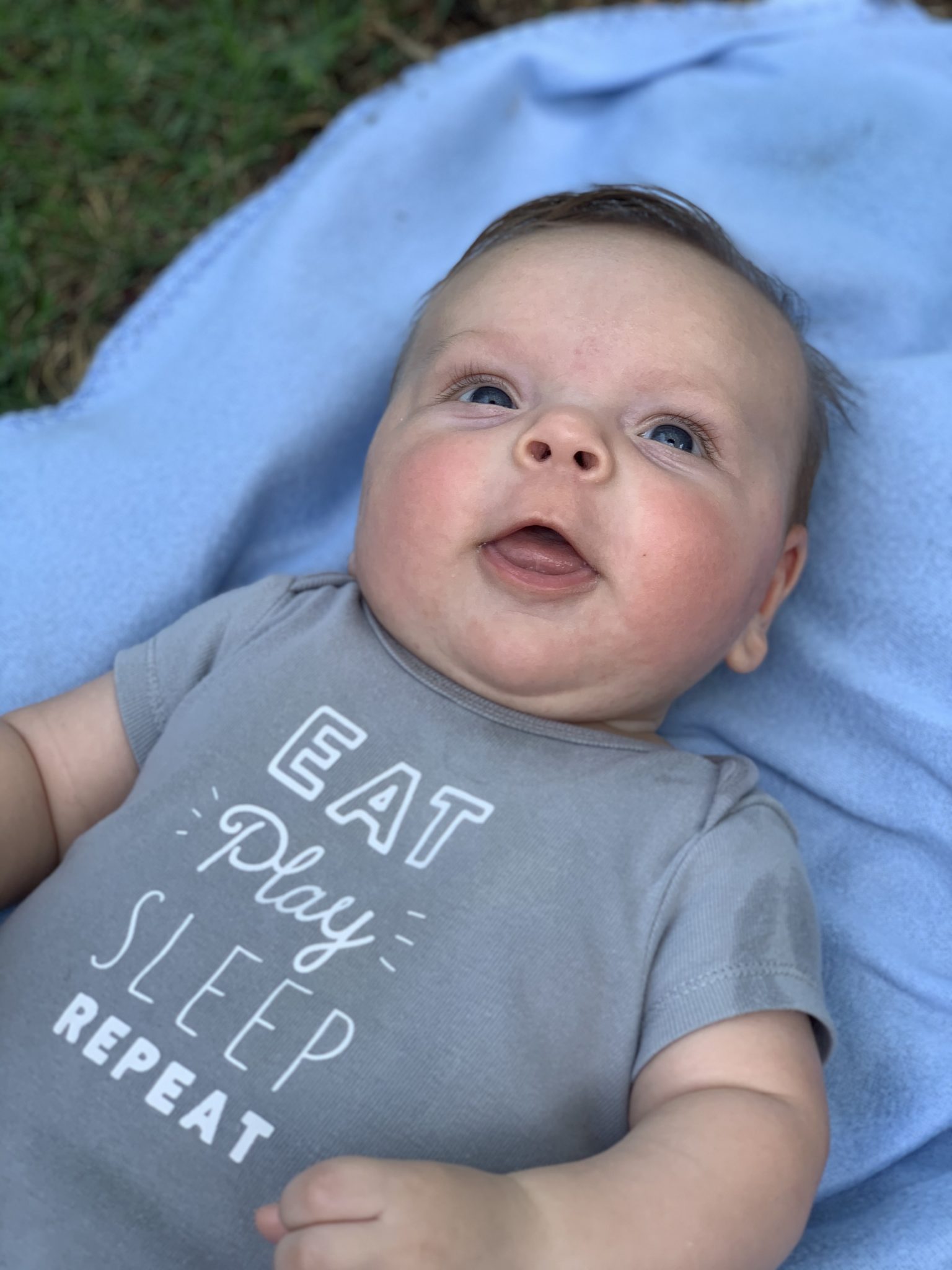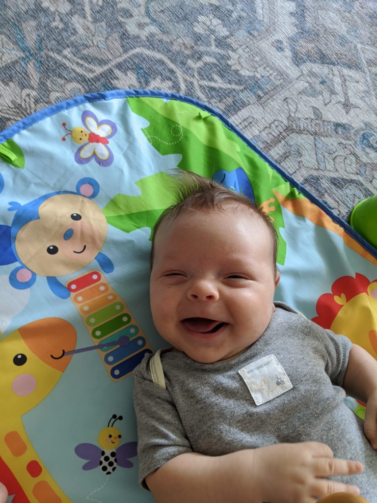 Caden is such a laid back and happy baby. He loves to just sit back and watch his big brother run around. For the first few weeks, Caden did nothing but sleep and eat, an experience that we did not have with Carson in the newborn phase (Carson did not like naps!). As Caden’s awake windows have widened, he is still fairly predictable with his naps and will sleep for a total of 3-4 hours throughout the day. [Edit: This was true up until the last few days!]